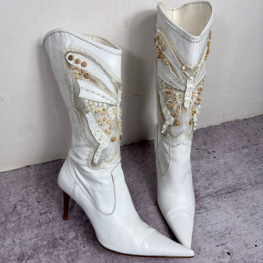 Le Silla Butterfly White Leather Beaded Boots 38/38.5