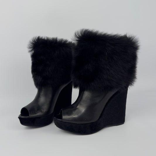 Prada Vintage Fur Wedge Peep Toe Booties — 36.5