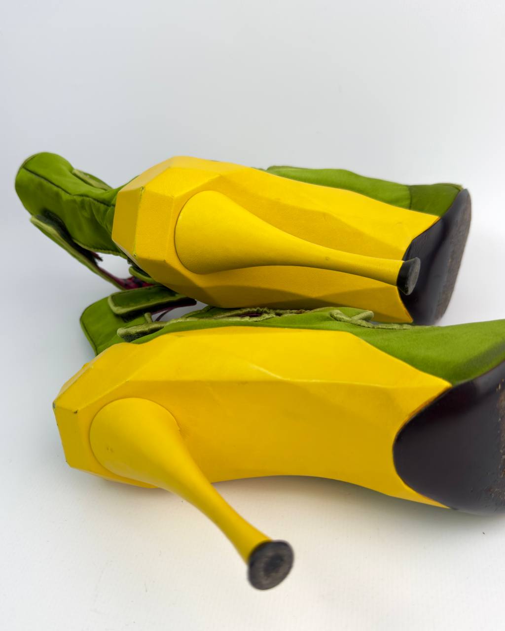 pre-owned item, minor darker spots in the toe satin area, and minor signs of wear on heels — normal for this model